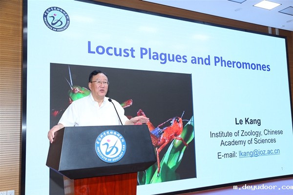 康乐院士向同学们作了题为“蝗虫成灾与信息素”的学术报告。康乐院士从飞蝗成灾的现状出发,深入浅出的展示了科研工作者发现问题、提出问题、分析问题、解决问题的过程,通过大量的实验确定了PAN是一种警戒信息素和毒素前体,但不是蝗虫聚集信息素;确定了4-乙烯基苯甲醚(4-Vinylanisole,4VA)是飞蝗的聚集性信息素、揭示了蝗虫在面对冲突的化学信号时决策过程的神经回路,说明了4VA和PAN对蝗虫群的形成与维持至关重要。